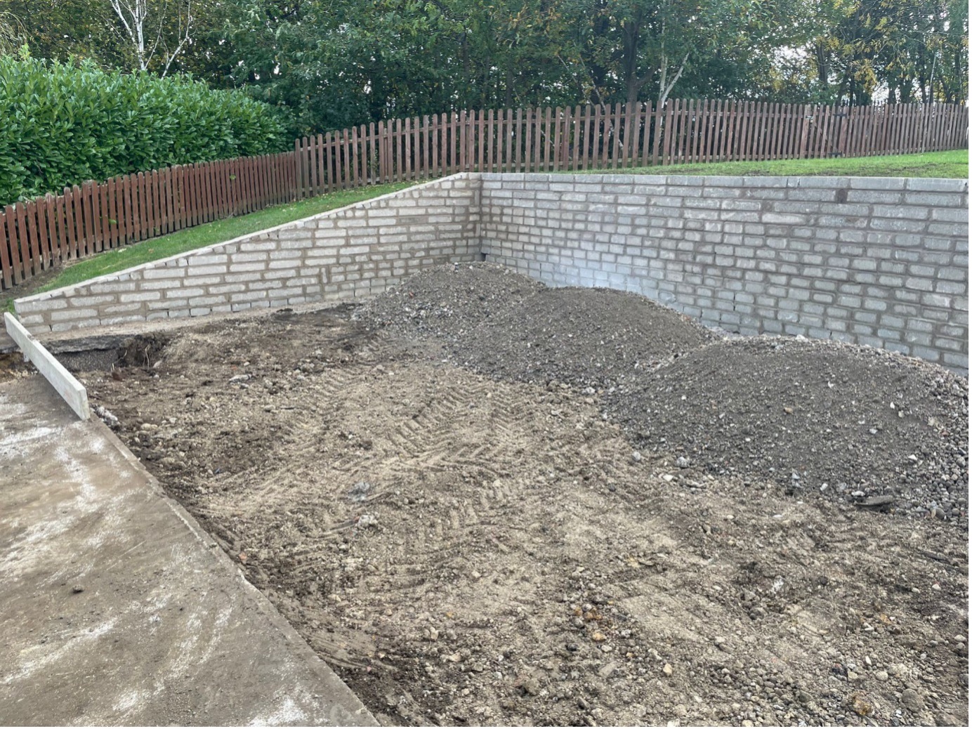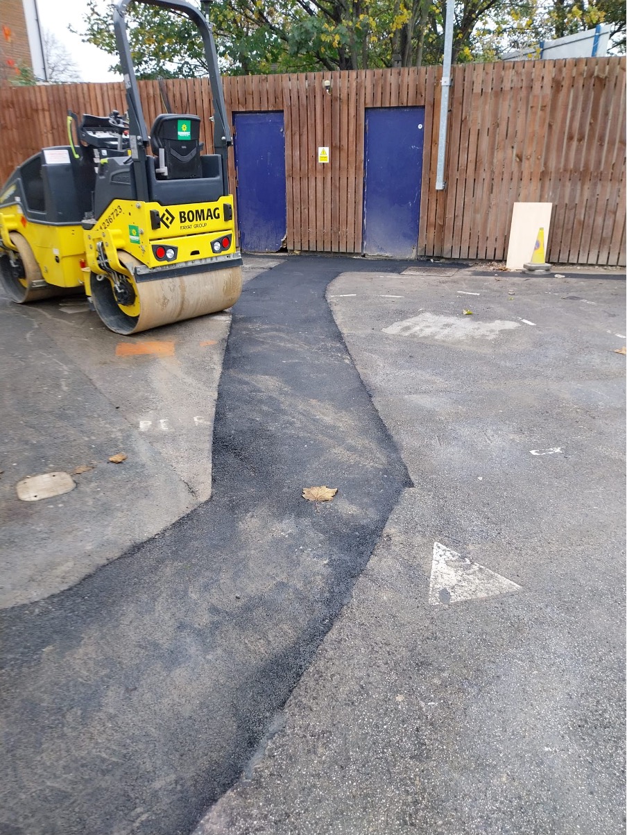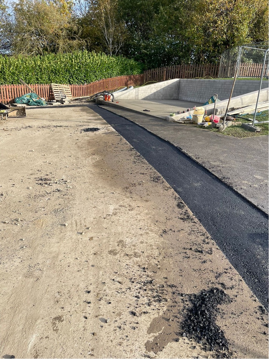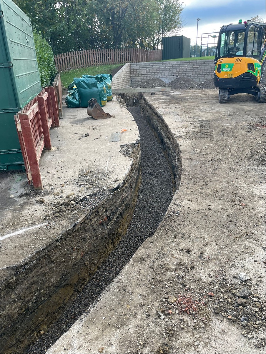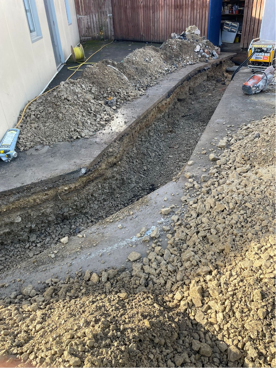The trench work was dug and completed in 5 days, winding through existing services, breaking out hard concrete and hand digging beneath a canopy where the excavator could not reach. This was all backfilled and reinstated with two layers of asphalt, some paving slabs and an area reinstated with artificial grass.