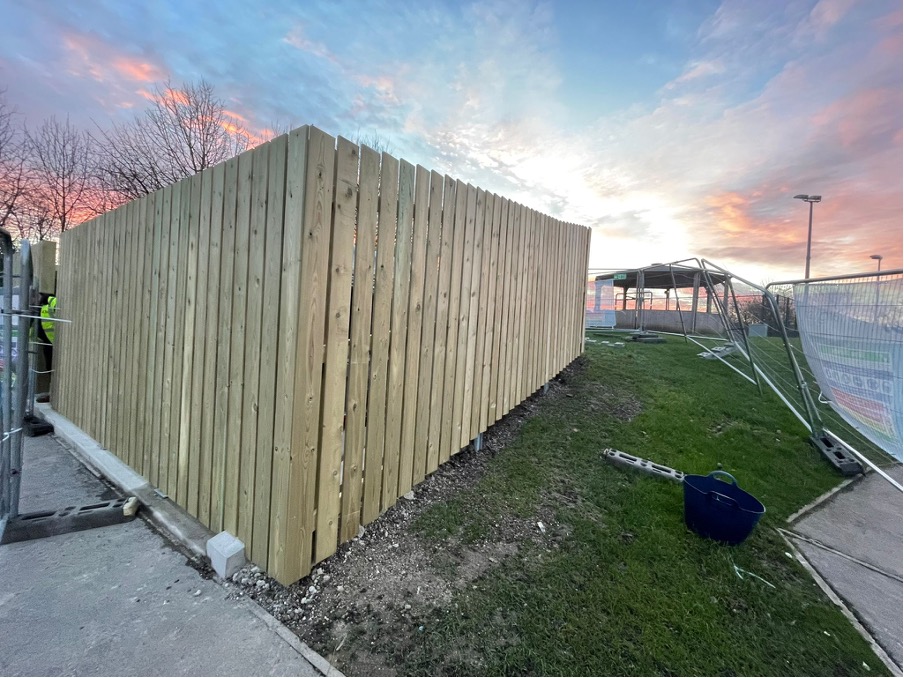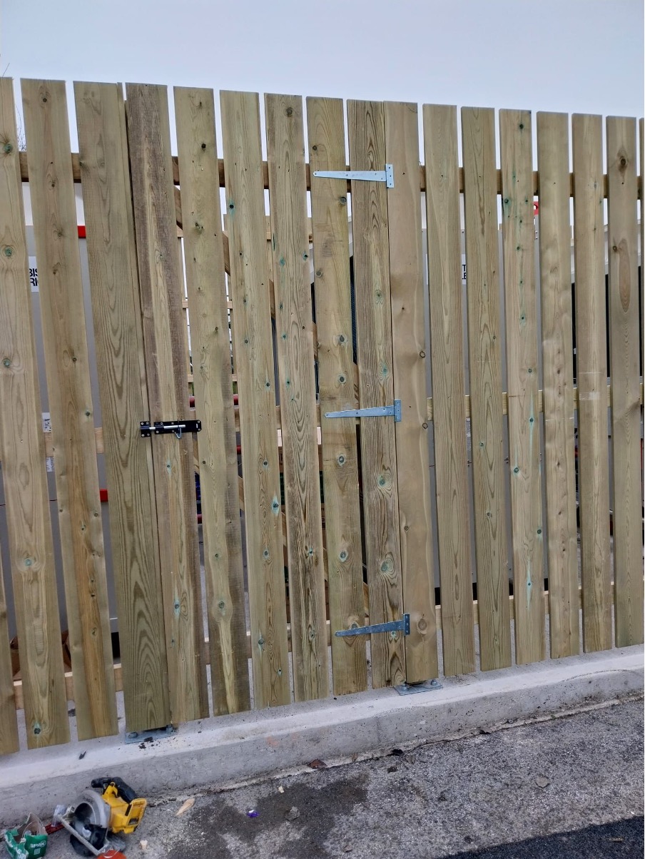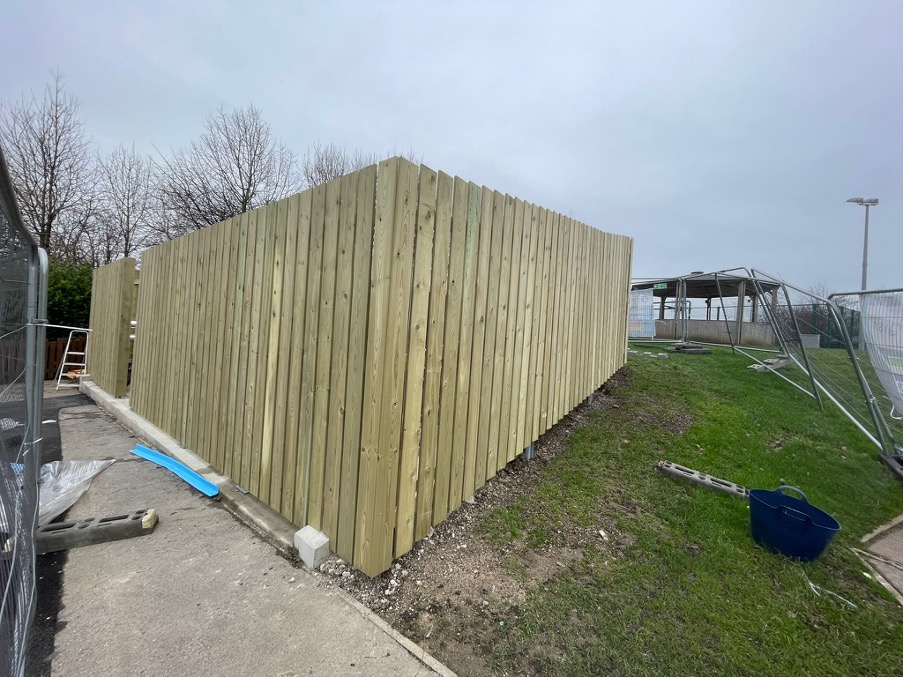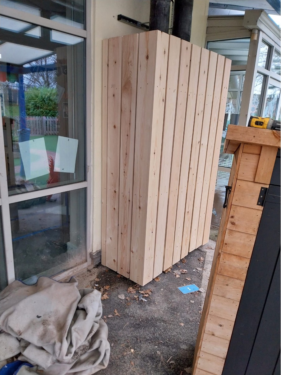 Using steel palisade fence posts, both bolt down and dig in, the timber hit and miss, play-safe fence was erected over a weekend to ensure safety for the children playing around the mechanical kit. An additional, matching timber enclosure was build where the pipes were fixed to the wall, to ensure protection and continuity for the project.